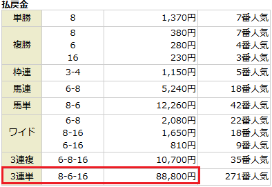 推奨投資金通りに馬券を買ったので、444,000円の獲得。