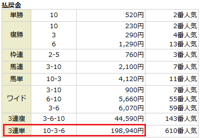 三連単配当は100円購入でも19万馬券。