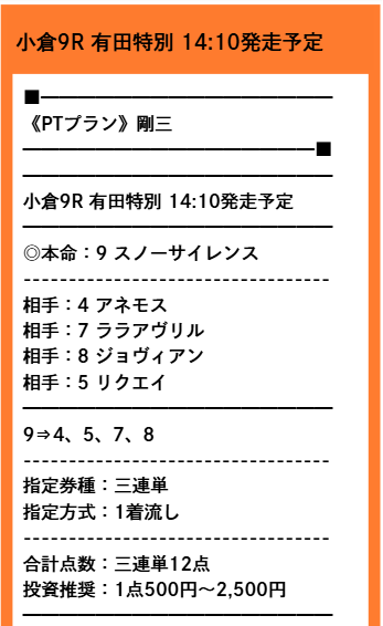 無料情報が2鞍バッチリ的中したところで、本命の予想師「剛三」の有料プラン三連単だ。