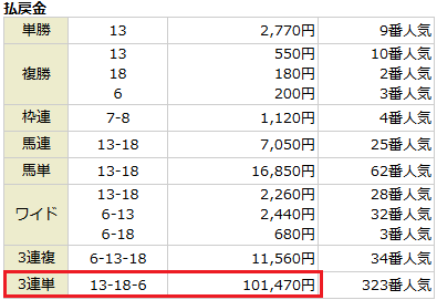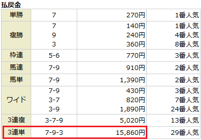 12番人気のトワニが3着に入ったことでもう少し払戻金は高額になるかと思ったのだが、意外にも3万馬券。