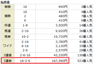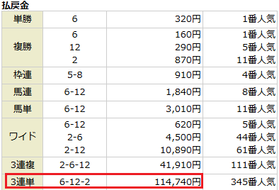 わずか6点という少点数で、しかも最小投資金の100円買いでも10万馬券以上の的中!
